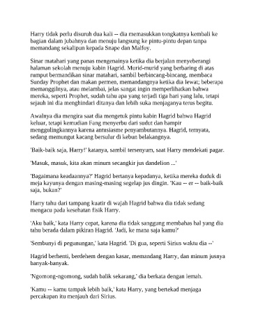 Hagrid berhenti, berdehem dengan kasar, memandang Harry, dan minum jusnya