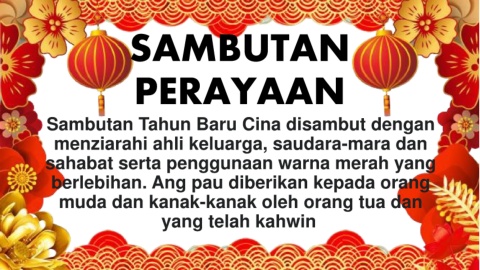 SAMBUTAN PERAYAAN Sambutan Tahun Baru Cina disambut dengan menziarahi ahli keluarga, saudara-mara dan sahabat serta penggunaan warna merah yang berlebihan. Ang pau diberikan kepada orang muda dan kanak-kanak oleh orang tua dan yang telah kahwin.