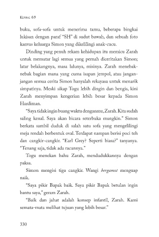 Simon mengisi tiga cangkir. Wangi bergamot menguap