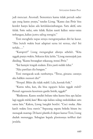 sama lain.” Kalem, Liong bangkit berdiri. “Cuci muka. Aku