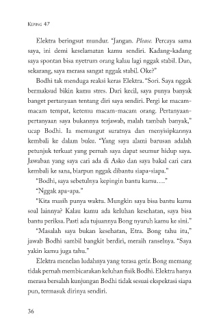Elektra beringsut mundur. “Jangan. Please. Percaya sama