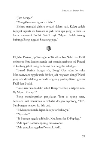 “Gue kan rada budek,” sahut Bong. “Bentar, si Mpret, nih.