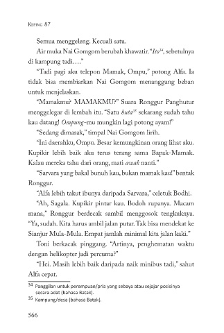 “Tadi pagi aku telepon Mamak, Ompu,” potong Alfa. Ia