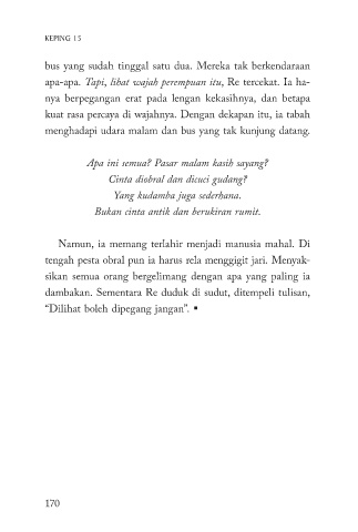 apa-apa. Tapi, lihat wajah perempuan itu, Re tercekat. Ia ha-
