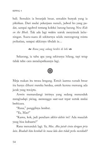 Rana menunduk lagi. Ya, Mas. Aku jatuh cinta dengan pria