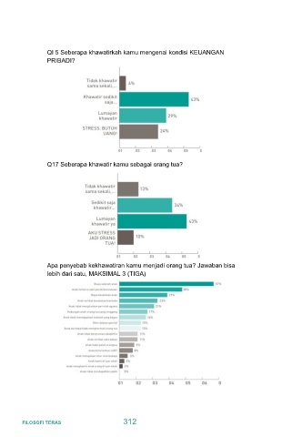 QI 5 Seberapa khawatirkah kamu mengenai kondisi KEUANGAN PRIBADI? Q17 Seberapa khawatir kamu sebagai orang tua? Apa penyebab kekhawatiran kamu menjadi orang tua? Jawaban bisa lebih dari satu, MAKSIMAL 3 (TIGA) FILOSOFI TERAS 312