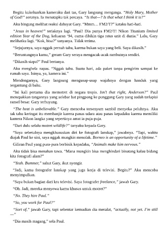 “Jesus in heaven!” teriaknya lagi. “Paul! Dia punya FM2/T! Nikon Titanium limited