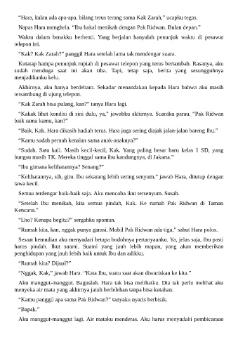 Napas Hara menghela. “Ibu bakal menikah dengan Pak Ridwan. Bulan depan.”
