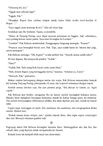 Pagi-pagi sekali Pak Ridwan berangkat bersama Hara. Meninggalkan aku dan Ibu, dan
