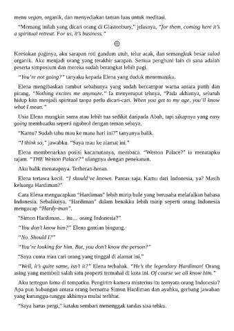Elena membenarkan posisi kacamatanya, membaca. “Weston Palace?” ia menatapku