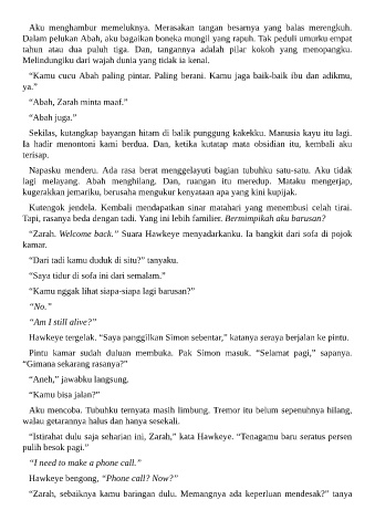 “Zarah. Welcome back.” Suara Hawkeye menyadarkanku. Ia bangkit dari sofa di pojok