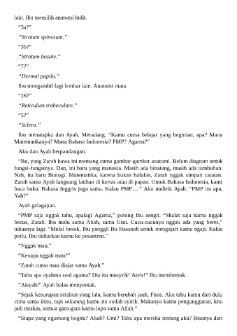 “PMP saja nggak tahu, apalagi Agama,” potong Ibu sengit. “Shalat saja kamu nggak