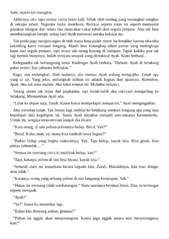 “Hutan ini memang tidak sembarangan.” Nada suaranya berubah berat. Dan, ia terdengar