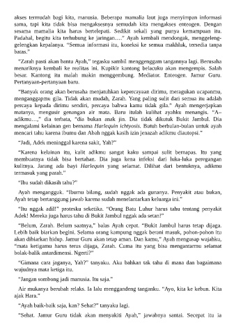 kulitnya. Jarang ada bayi Harlequin yang selamat. Dilihat dari bentuknya, adikmu