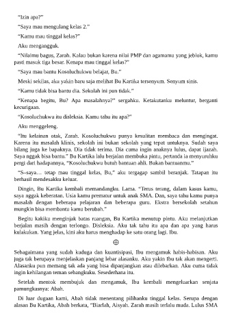 alasan Bu Kartika, Abah berkata, “Biarlah, Aisyah. Zarah masih terlalu muda. Lulus SMA