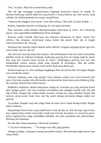 Kuinjak-injak api itu. Dan, kudengar lengkingan Hara dan jeritan Ibu, bercampur dengan