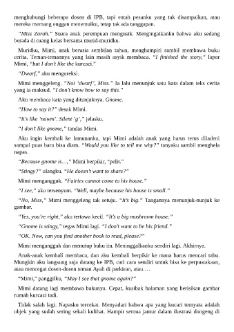 Mimi menggeleng. “Not ‘dwarf’, Miss.” Ia lalu menunjuk satu kata dalam teks cerita