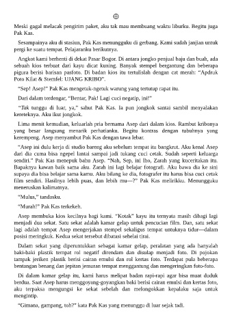 “Tak tunggu di luar, ya,” sahut Pak Kas. Ia pun jongkok santai sambil menyalakan