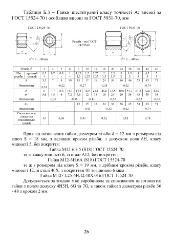 Таблиця Б.3 – Гайки шестигранні класу точності А: високі за