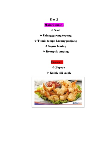 Day 2 Main Course : ❖ Nasi ❖ Udang goreng tepung ❖ Tumis tempe kacang panjang ❖ Sayur bening ❖ Kerupuk emping Dessert : ❖ Pepaya ❖ Kolak biji salak