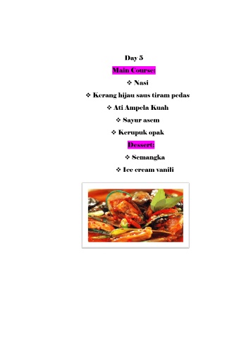 Day 5 Main Course: ❖ Nasi ❖ Kerang hijau saus tiram pedas ❖ Ati Ampela Kuah ❖ Sayur asem ❖ Kerupuk opak Dessert: ❖ Semangka ❖ Ice cream vanili