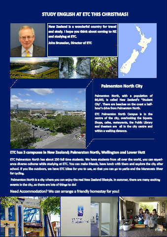 ETC has 3 campuses in New Zealand; Palmerston North, Wellington and Lower Hutt