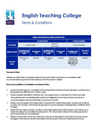 where the family has cancelled the placement , ETC will provide 2 weeks of homestay placement