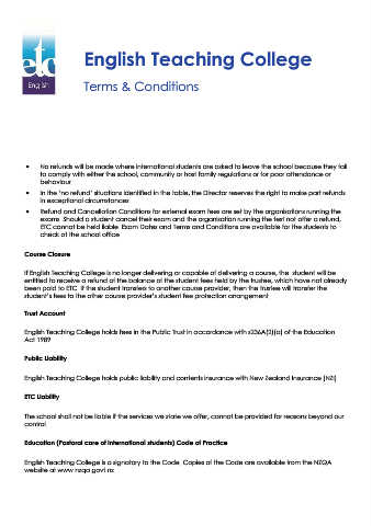 English Teaching College is a signatory to the Code. Copies of the Code are available from the NZQA