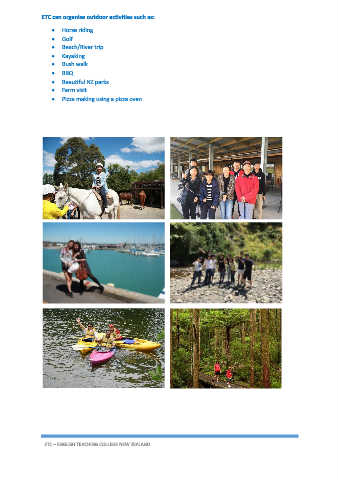 ETC can organise outdoor activities such as: Horse riding Golf Beach/River trip Kayaking Bush walk BBQ Beautiful NZ parks Farm visit Pizza making using a pizza oven ETC – ENGLISH TEACHING COLLEGE NEW ZEALAND