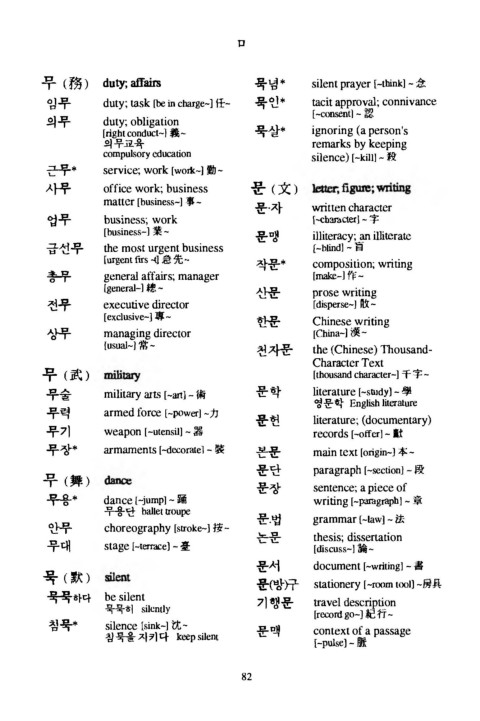 무 ( 務 ) duty; 교a f 묵넘* silent prayer [-think] - 念