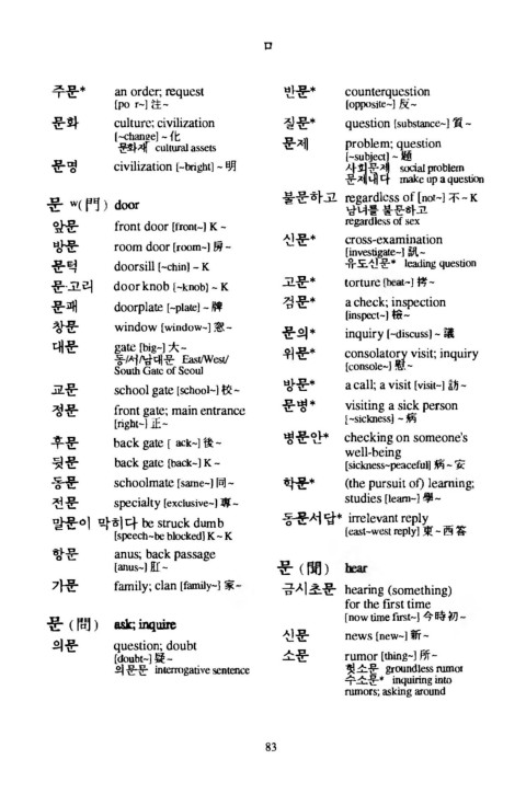 정문 front gate; m a i n entrance 문병* visiting a sick p e r s o n