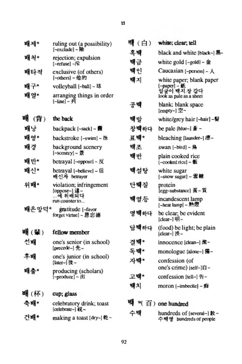배 (背 ) the b a c k 백발 wh ite/grey hair [ - ^ r ] -혈