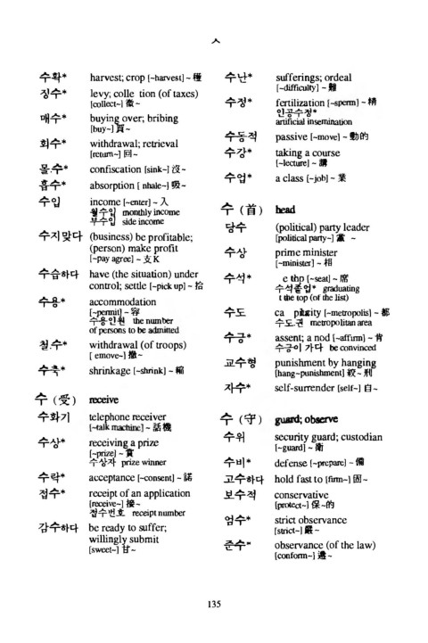 수확* harvest; crop [-h^est] - 獲 수난* sufferings; ordeal