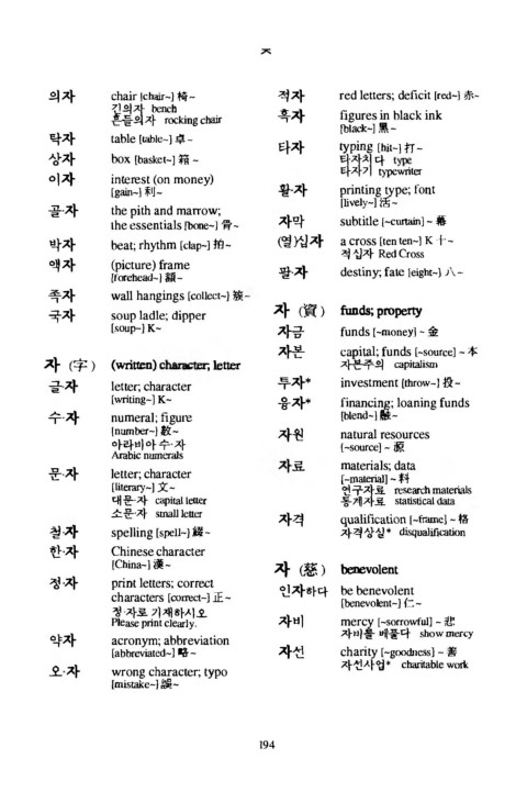 의자        c h a ir  chair니 椅~        적자        re d  le tte rs ;  d e fic it [red-] 赤~