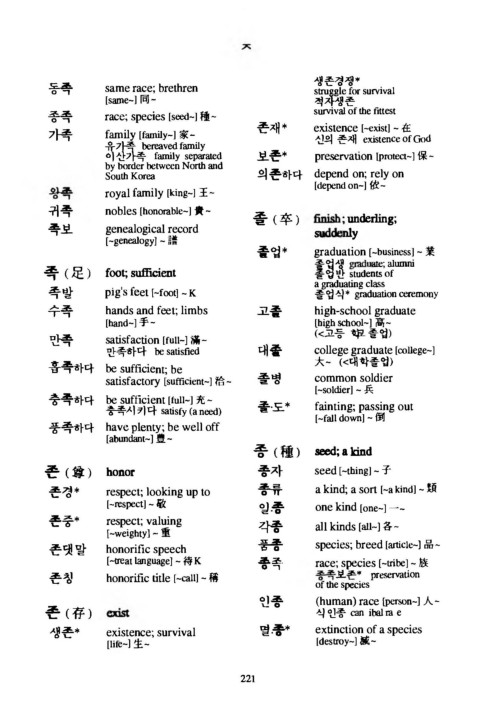 존   ( 尊 )  h o n o r                  종자        se e d  [-tb in g ] -  子