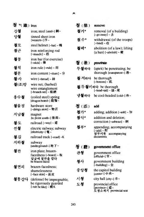 강철 iron; steel fsteel-] 鋼- 철거* r e m o v a l (of a building)