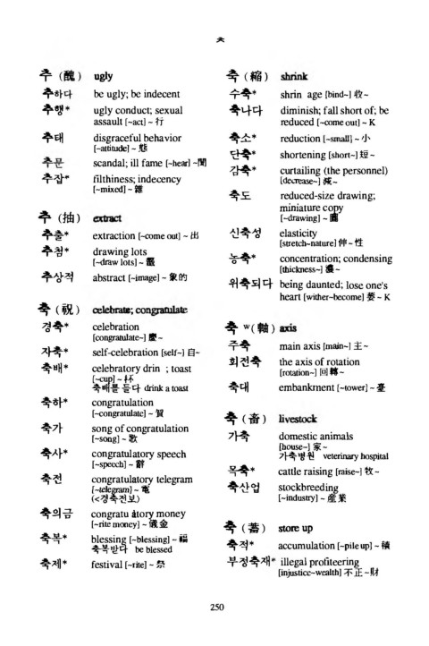 추 b e ugly; b e indecent 수축* shrin a g e [bind-] 收~