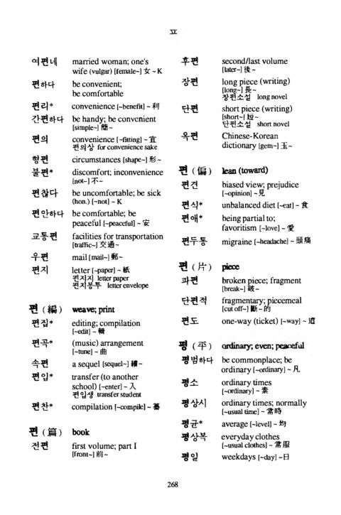 편하다 b e convenient; 장편 l o n g piece (writing)