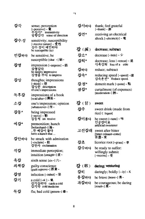 감각 sense; p e rc e p tio n 감사하다 th a n k ; fe e l g ra te fu l