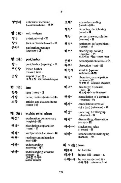 해 (解 ) 없 solve; 빠 [-disperse] ᅳ敗