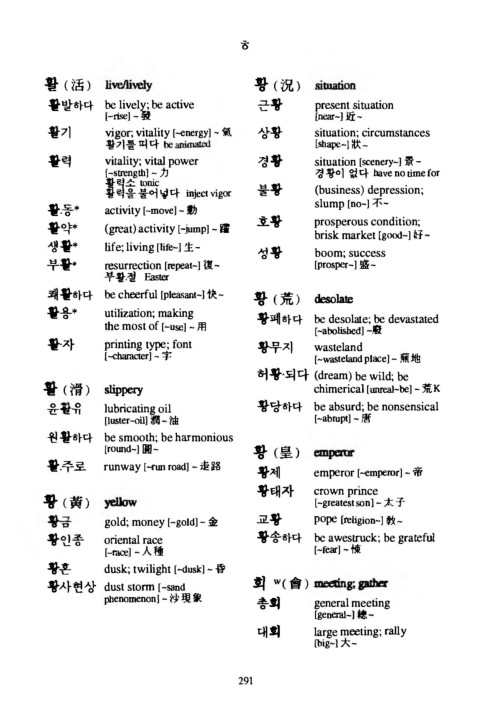 활력 vitality; vital p o w e r 경황 situation [scenery-] 景 -