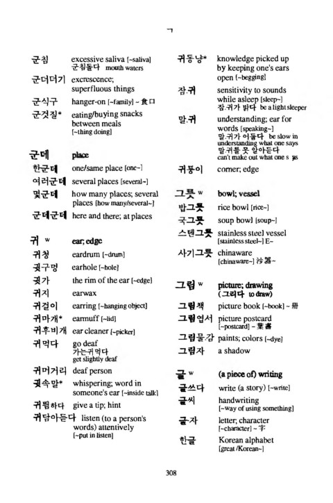 군침 excessive saliva [-saliva] 귀동냥* k n o w l e d g e p i c k e d u p