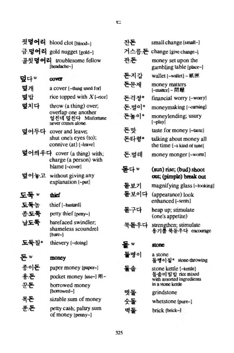 덮 어두다 c o v e r a n d leave; 든밋■ taste for m o n e y [«ste]
