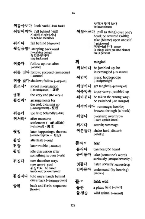 뒤 떨 어 지 다 fall b e h i n d [-f해] 뒤 집 어쓰다 p 띠1 (a thing) o v e r one's