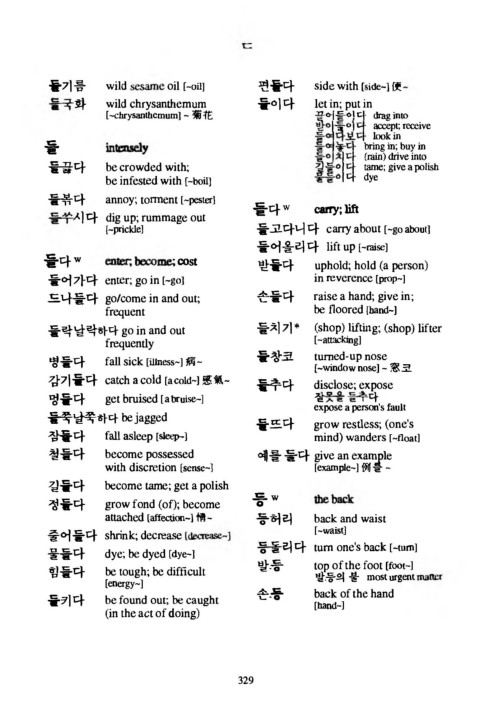 드나들다 g o / c o m e in a n d out; 손 들 다 r없se a h a n d ; give in;