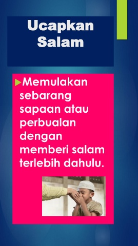 Ucapkan Salam Memulakan sebarang sapaan atau perbualan dengan memberi salam terlebih dahulu.