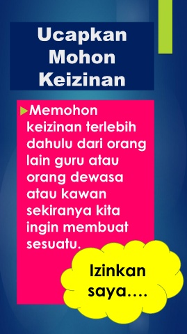 Ucapkan Mohon Keizinan Memohon keizinan terlebih dahulu dari orang lain guru atau orang dewasa atau kawan sekiranya kita ingin membuat sesuatu. Izinkan saya….
