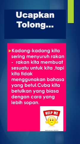 Ucapkan Tolong… Kadang-kadang kita sering menyuruh rakan - rakan kita membuat sesuatu untuk kita ,tapi kita tidak menggunakan bahasa yang betul.Cuba kita betulkan yang biasa dengan cara yang lebih sopan.