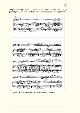 kompozitorlarning ijodi, uslubiy qonuniyatlar, klarnet cholg‘usiga qo‘yiladigan XX asr texnik mahorat talabalaridan xabardor bo‘lmog‘i lozim. , 8-ilova. E. Bozza. Bukolika. Andantino mosso ma non troppo. 186