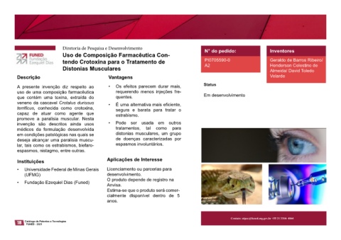 tendo Crotoxina para o Tratamento de PI0705590-0 Geraldo de Barros Ribeiro/ o Tratamento de Distonias Musculares A61K 35/58; A61P 21/00; A61P 25/00; A61P 27/02; A61P 17/00